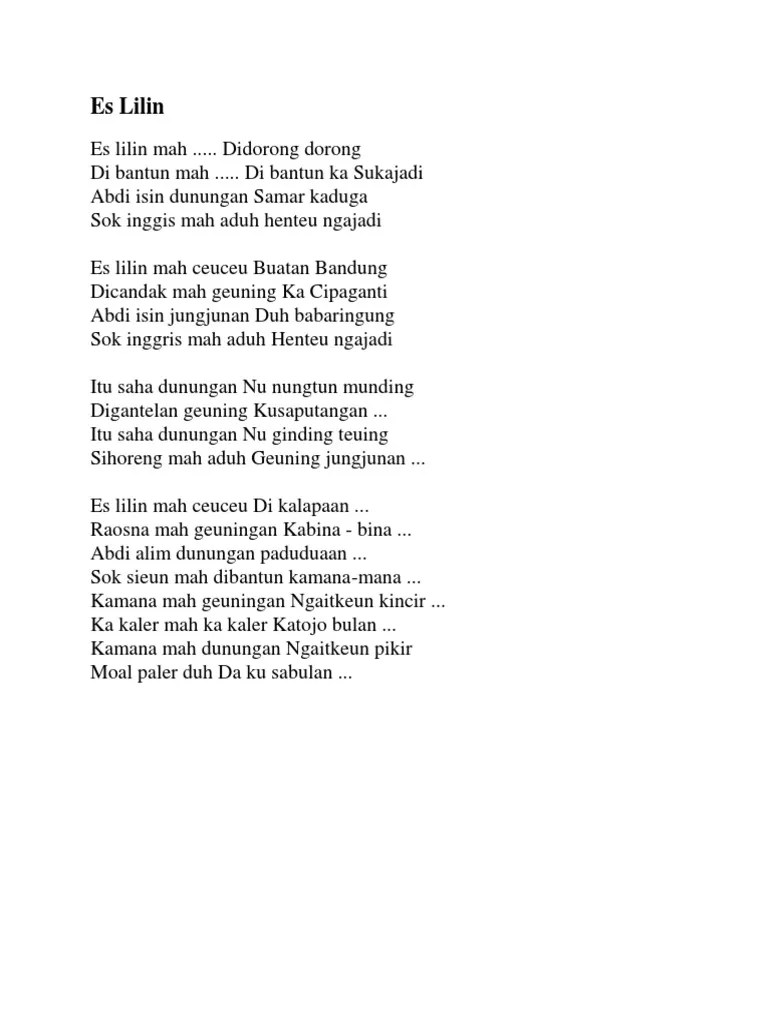 Ini es lilin aduh.sudah terpuji. Sok inggis mah aduh henteu ngajadi. Es lilin mah ceuceu buatan bandung. Nining meida judul lagu : Dicandak mah geuning ka cipaganti. Dibantun mah dibantun ka sukajadi., itulah cuplikan liriknya. Seluruh liriknya menggunakan bahasa jawa dan pernah dipopulerkan oleh nining meida. Lagu daerah biasanya dimainkan dengan alat musik seperti gamelan, angklung dan lain sebagainya. Clearing them fixes certain problems like loading or. Inilah lirik lagu es lilin yang dipopulerkan oleh lagu daerah. Aninom (ibu mursih) album : Abdi isin dunungan samar kaduga. Hatur nuhun laguna jadi abdi tiasa ngiringan ngalestarikeun lagu lagu sunda .
